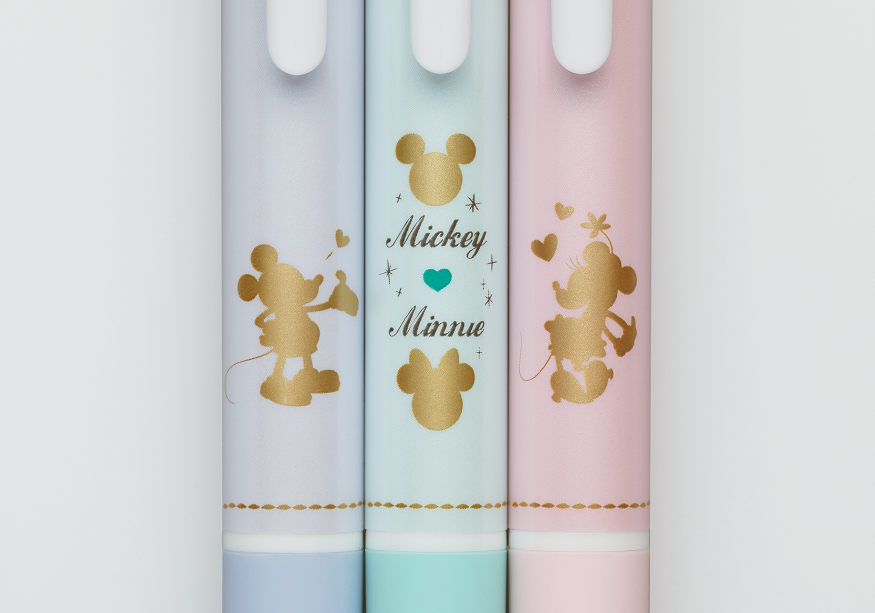 上:「ミッキーマウス」のシルエットをかたどった消し具キャップ ■『uni-ball R:E/ディズニーシリーズ』、大人気のディズニーキャラクターの限定デザイン 『uni-ball R:E/ディズニーシリーズ』は世代・性別を問わず大好評のディズニーキャラクターを軸デザインに取り入れた人気シリーズです。インク色は全てオフブラックで、お好みの柄をお選びいただけます。 ●「ミッキーマウス」「ミニーマウス」のシルエットを描いた3種のデザイン いずれもさりげなくキャラクターアイテムを持ちたい社会人向けに、シンプルなカラーリングで軸色に統一感を持たせたデザインです。 3本を並べると、「ミッキーマウス」が「ミニーマウス」に投げキッスをするデザインです。 シルエットを描いたこちらのデザインは、3本セットとしても発売いたします。