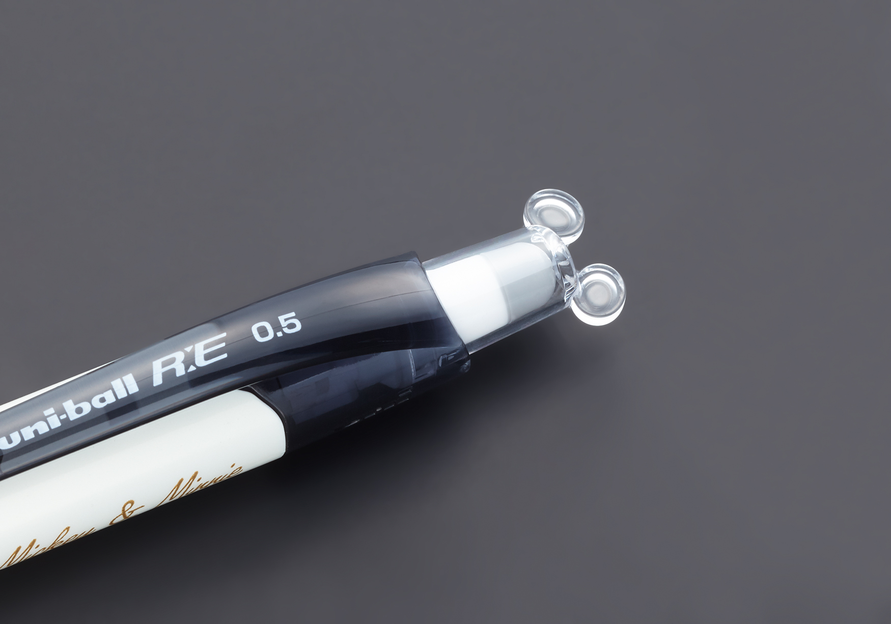 三菱鉛筆株式会社(本社:東京都品川区 社長:数原英一郎)は、ノック式消せるボールペン『uni-ball R:E(ユニボール アールイー)』の、大人気のディズニーキャラクターを軸にデザインした、『uni-ball R:E/ディズニーシリーズ』から「ミッキーマウス」のシルエットをかたどった新しい形状の消し具キャップ付きの新柄(本体価格:200円+税/インク色:オフブラック/全6種)を、3月20日(金)に数量限定で発売いたします。 『uni-ball R:E/ディズニーシリーズ』は世代・性別を問わず大好評のディズニーキャラクターを軸デザインに取り入れています。消し具キャップは「ミッキーマウス」のシルエットをかたどり、かわいらしく仕上げました。 柄はキャラクターアイテムをさりげなく使用したい社会人のニーズに応えて、キャラクターのシルエットがシンプルなデザインや、人気のキャラクターがくっきりと目立つデザインなど、お好みで選んでいただけるラインアップをそろえました。シルエットがシンプルなデザインは、並べると「ミッキーマウス」が「ミニーマウス」に投げキッスをするデザインです。