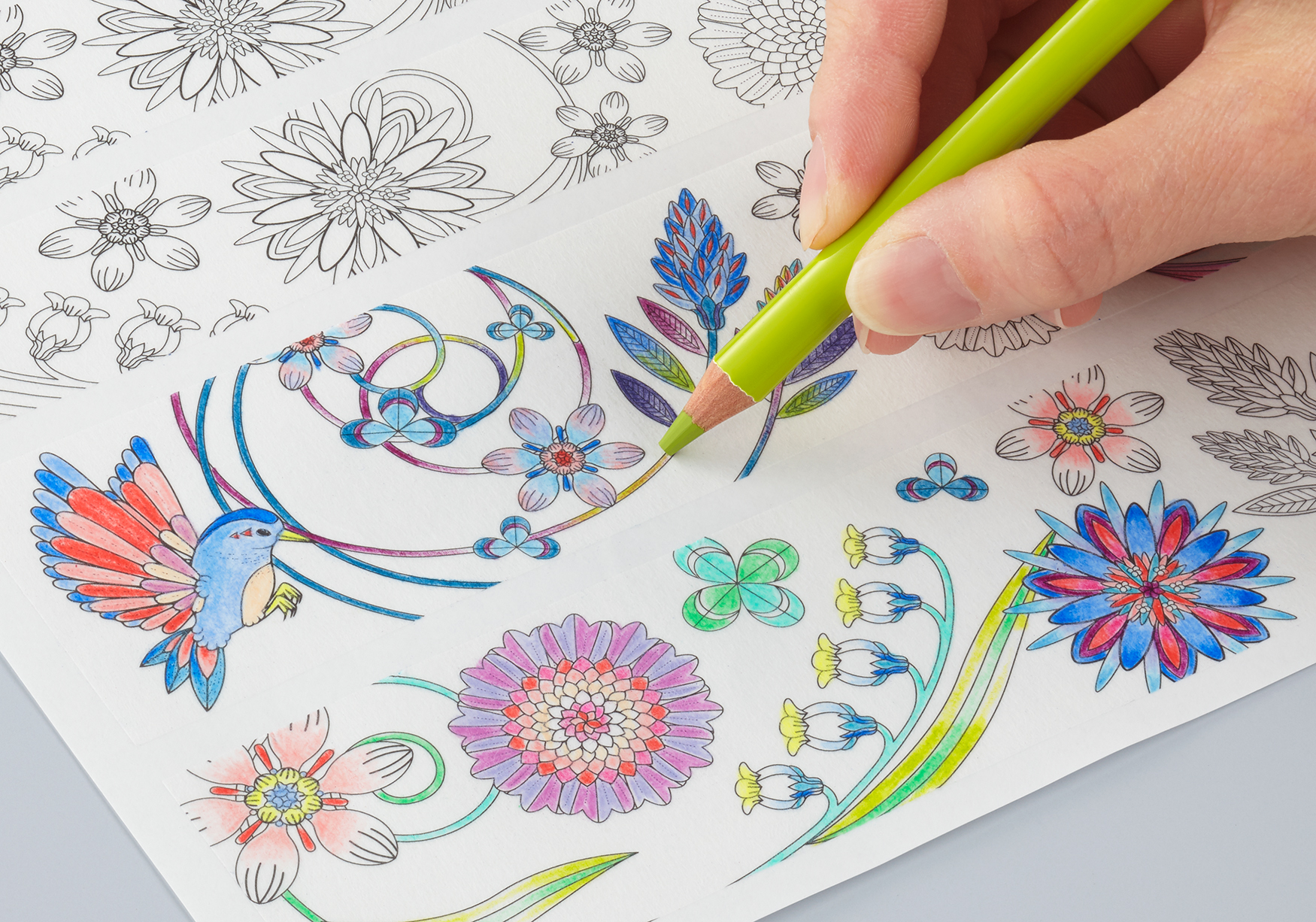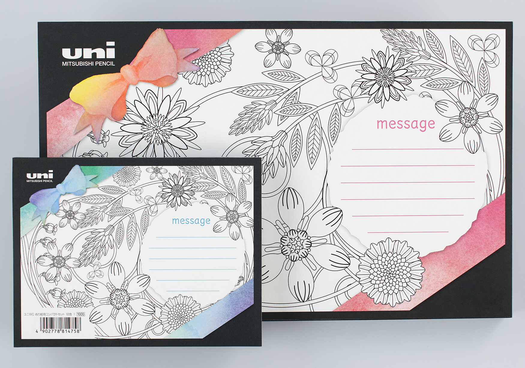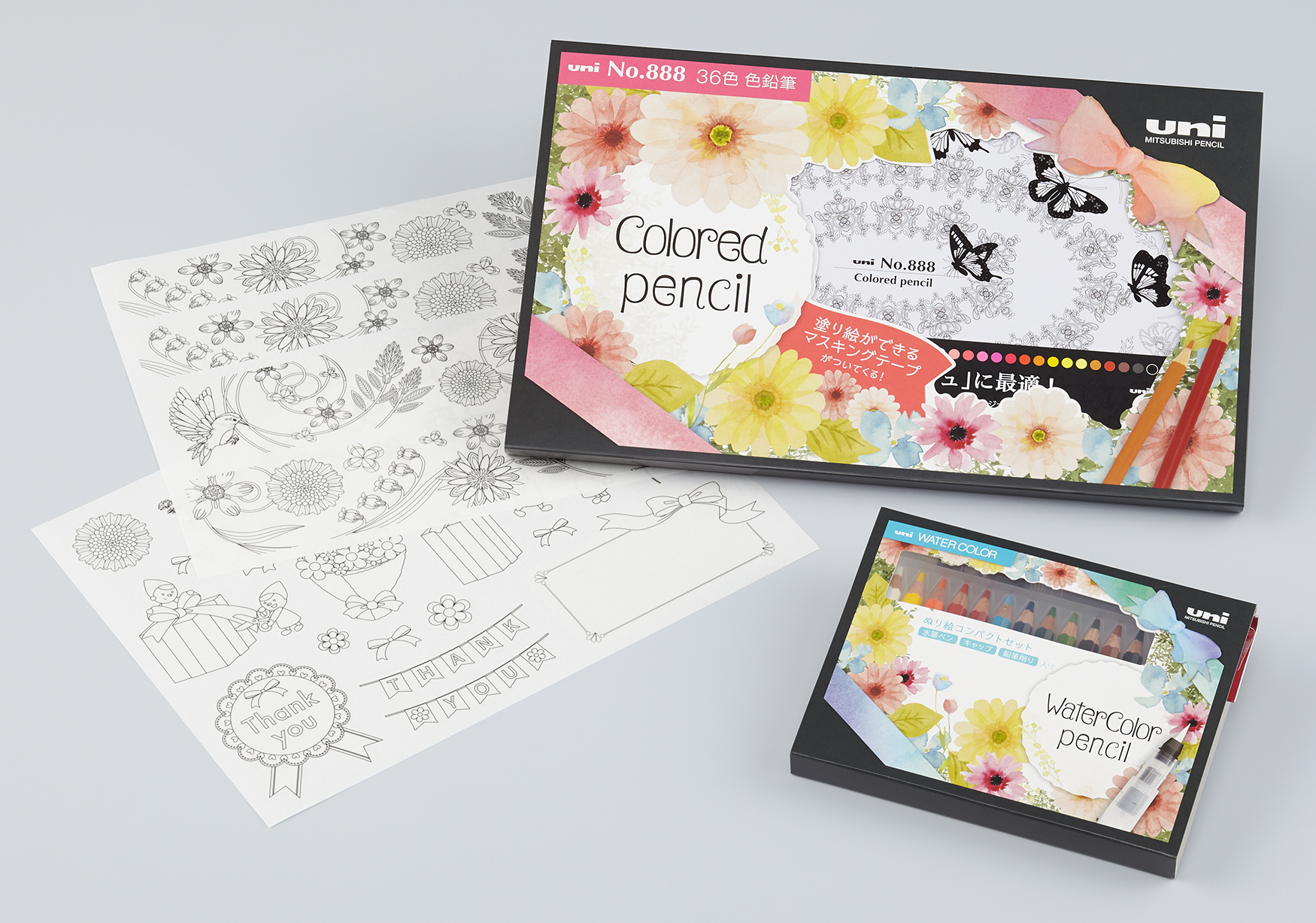 色鉛筆36色セットと2種類の塗り絵マスキングシートがセットになった『色鉛筆 No.888 母の日ギフトセット』&ギフトスリーブ仕様『uni ウォーターカラー ぬり絵用コンパクトセット』