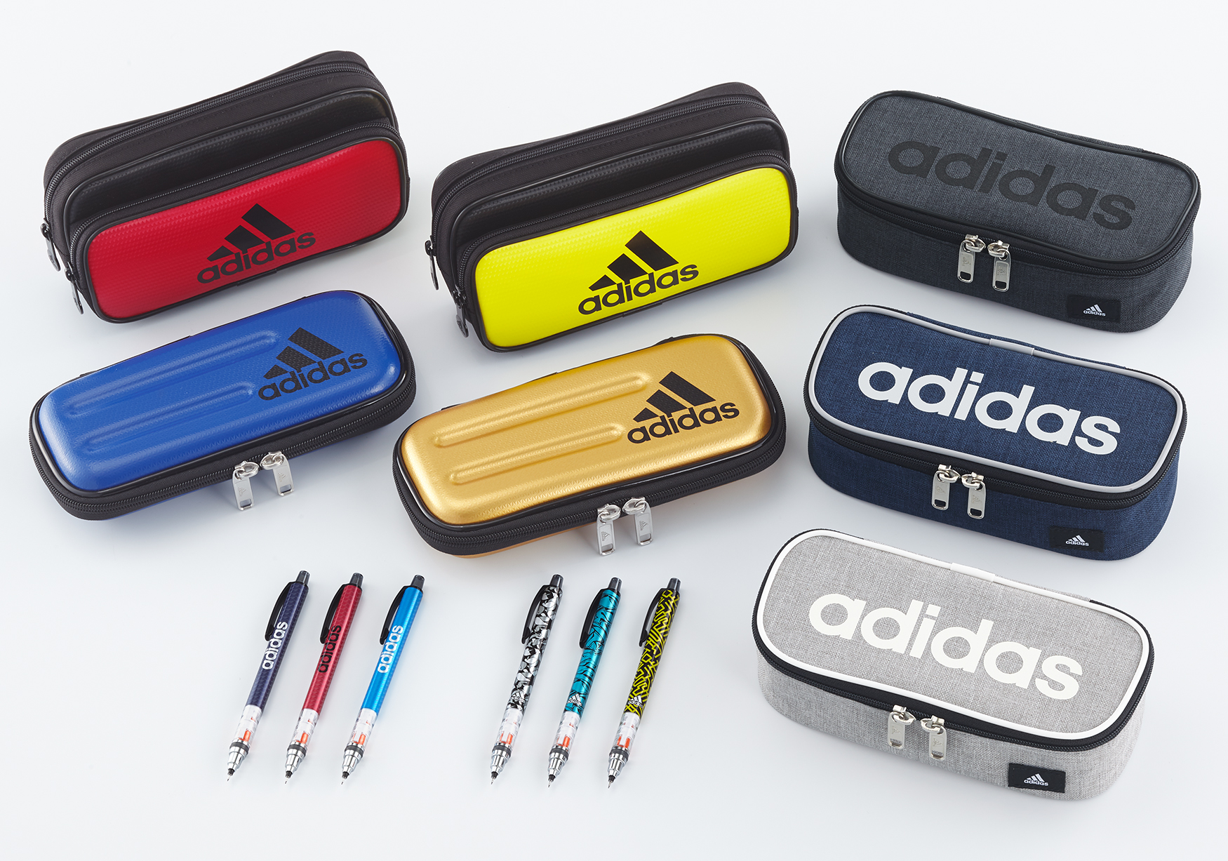 <“アディダス”ステーショナリー・サマー2018> 左上から:ソフトペンケース ダブルポケットPT-1500AI(赤黒、黄黒)、