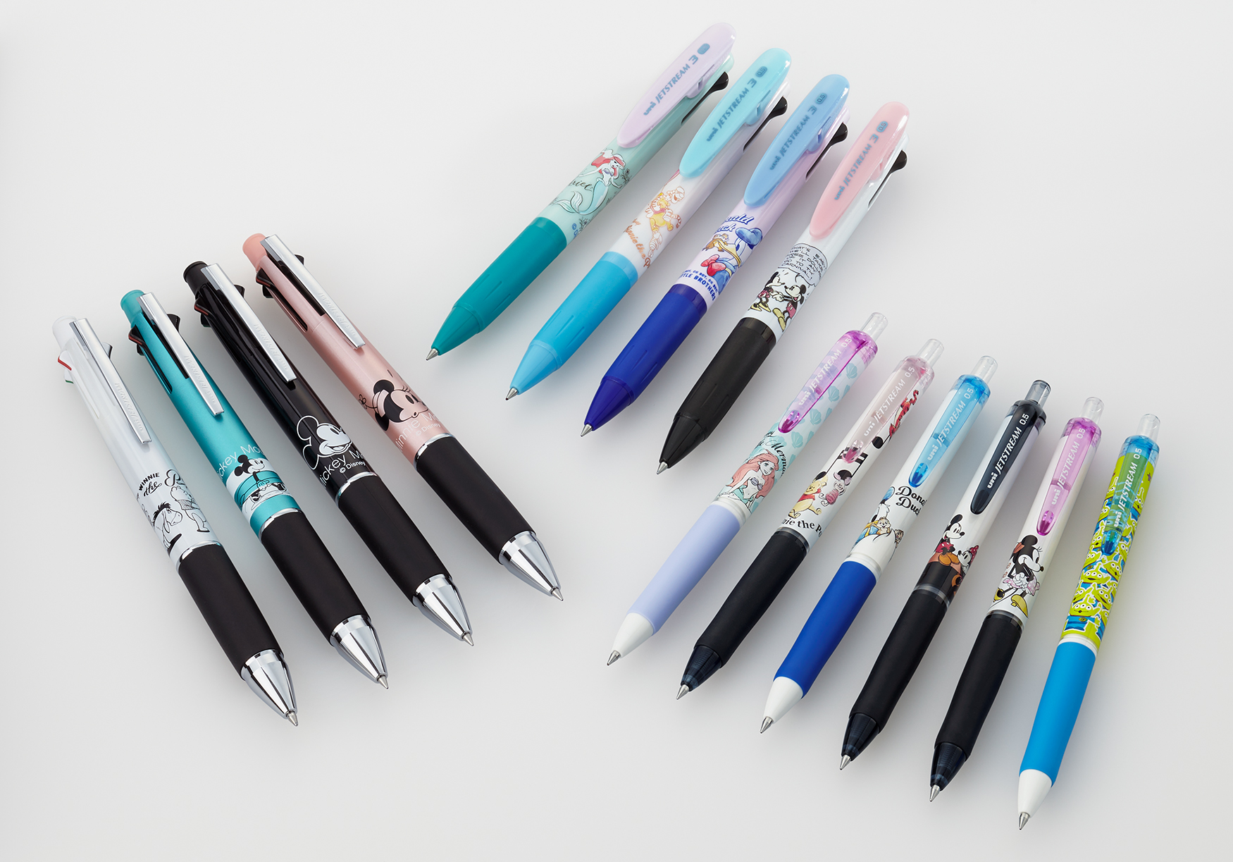 キャラクターをイメージした配色の「アリエル」と「エイリアン」は、ジェットストリームの軸デザインに初採用のキャラクターです。「ミッキーマウス&ミニーマウス」のようにシックなデザインも取りそろえています。