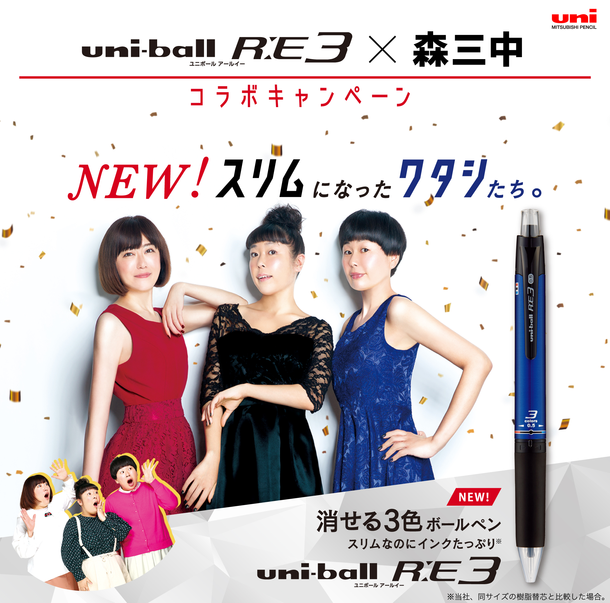 三菱鉛筆株式会社(本社:東京都品川区 社長:数原英一郎)は、スリムなのに、インクたっぷりのノック式消せる3色ボールペン『uni-ball R:E 3(ユニボール アールイースリー)』と人気女芸人トリオの森三中がボールペン同様にスリムになった姿をイメージし、コラボしたキャンペーンとして、三菱鉛筆キャンペーン公式アカウント(Twitter(@mpuni_campaign))をフォローし、指定のTwitter投稿をリツイートしていただいた方の中から抽選で、毎日景品が当たるキャンペーンを2019年1月24日(木)から開催いたします。