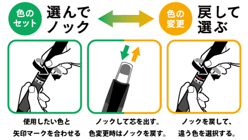 新開発の「回転セレクトノック機構」は、軸を回転させて使いたい色を選択し、軸後端をノックして芯を繰り出す新しい機構です。この機構を使うことで従来の多色ボールペンのスライドノックレバーをなくし、握りやすくデザイン性に優れたスリムな軸を実現することができました。