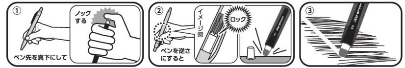 筆記時は一般的なノック式ボールペンと同様に、ペン先を下に向けるとスムースにノックが可能です。消去する際は軸を逆さにするだけで内蔵されている「ロック機構」が作動し、消し具を固定するのでしっかりと消すことができます。