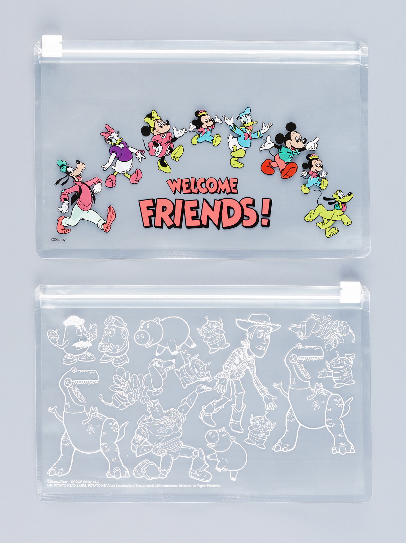 「ディズニー」のクリアポーチはトレンドのレトロ&ポップなテイストのキャラクター柄がカラフルな、「ミッキーマウス」と仲間たちの愉快なデザインです。「トイ・ストーリー」はモノトーンにキャラクター柄がプリントされています。