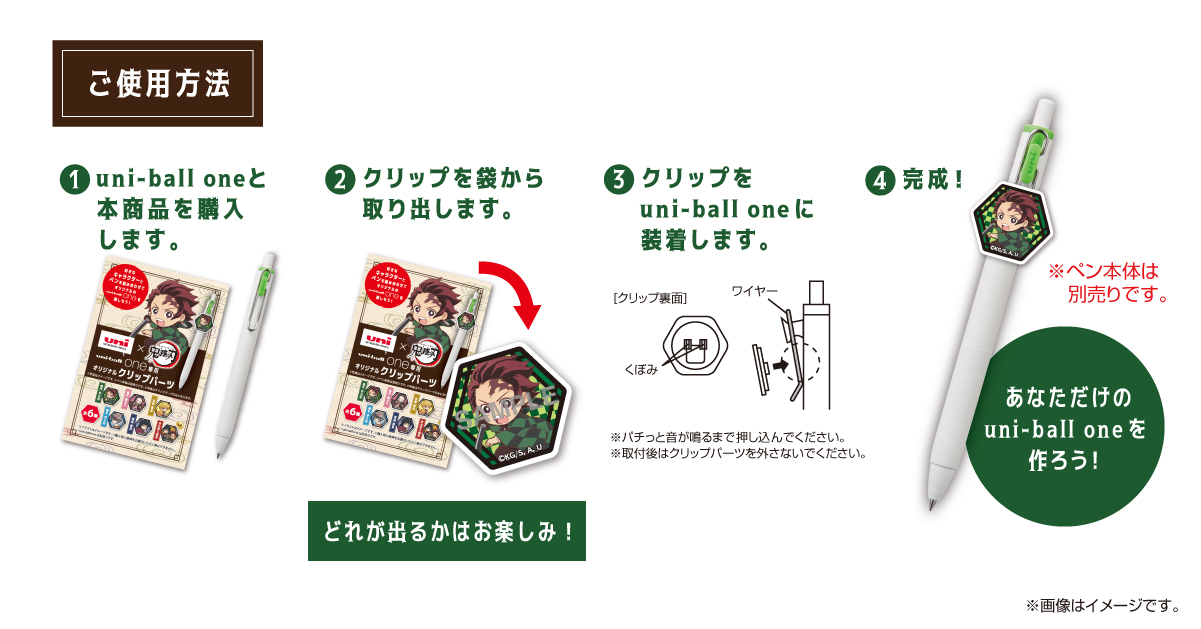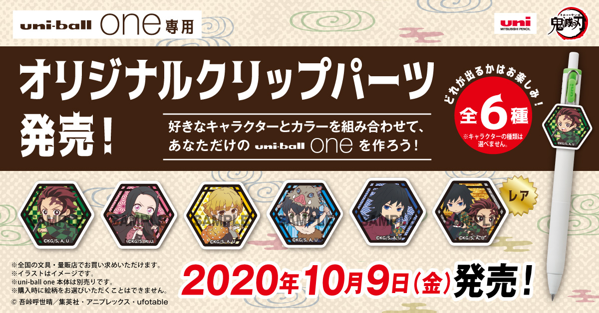 三菱鉛筆株式会社(本社:東京都品川区、社長:数原滋彦)は、新開発ゲルインクとシンプルでストレートな軸デザインが特徴的な新しいゲルインクボールペン、「uni-ball one(ユニボール ワン)」(本体参考価格132円:税抜 120円/インク色:全20色(0.38mm)、全10色(0.5mm))専用のカスタマイズ商品『ユニボール ワン専用 オリジナルクリップパーツ』(本体参考価格220円:税抜 200円/全6種)を、10月9日(金)より数量限定で発売いたします。TVアニメ「鬼滅の刃」のキャラクターをラインアップしたオリジナル商品となります。