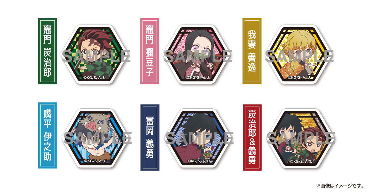 今回、TVアニメ「鬼滅の刃」から「竈門炭治郎/竈門禰豆子/我妻善逸/嘴平伊之助/冨岡義勇」をラインアップしました。各キャラクターのデフォルメイラストに、それぞれのイメージカラーと、伝統的な和柄を組み合わせ、差し色に黒を用いて統一感を持たせたデザインです。レアデザインである「竈門炭治郎&冨岡義勇」ペアを含めた、全6種類をランダム形式で販売いたします。