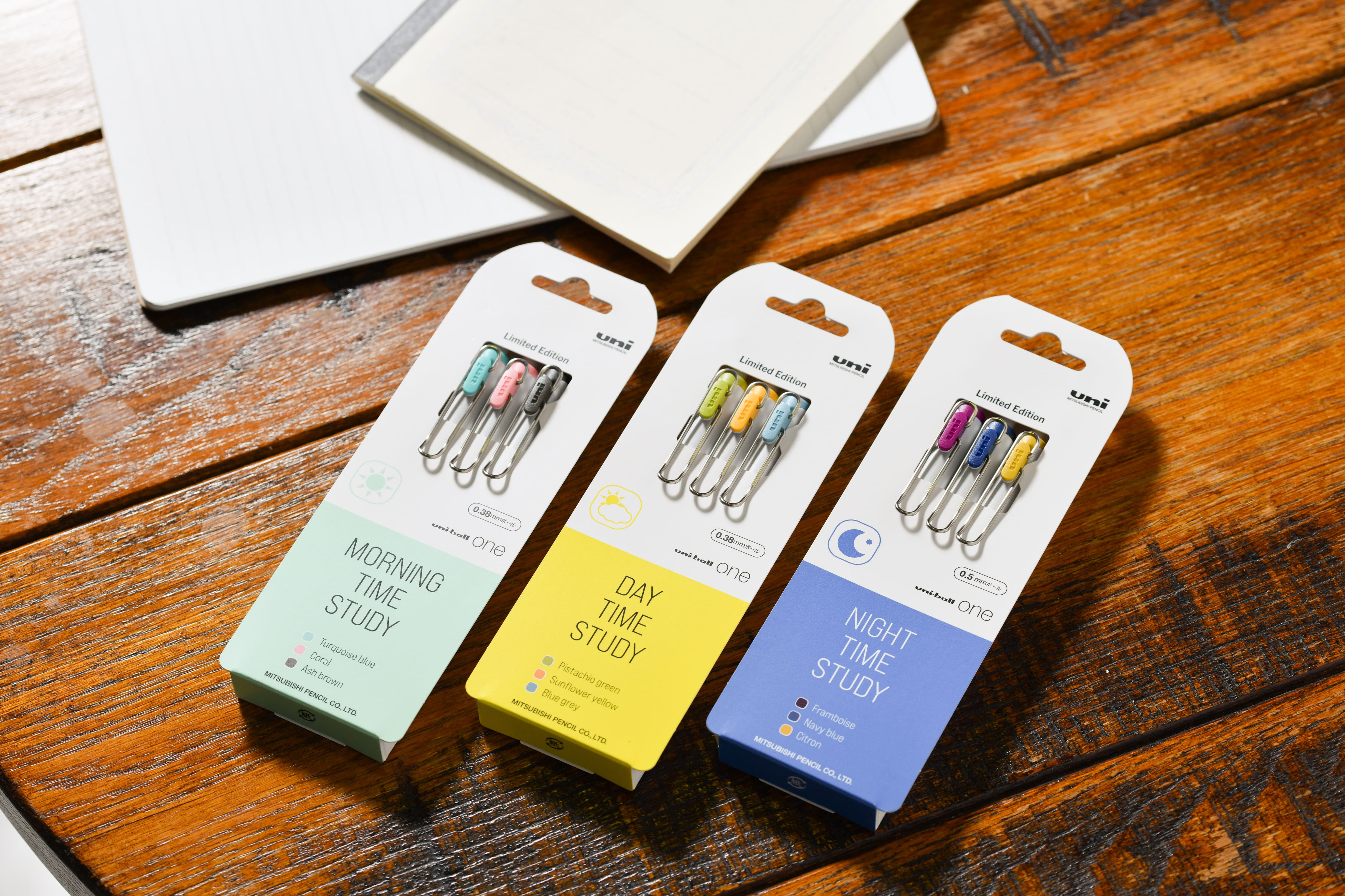 今回の限定商品は、既存品にはないインク色で、ノートを個性豊かに彩どることができる秋冬のテーマカラーを採用しました。 昨今、特に学生の間では、SNSで朝・昼・夜という時間帯を意識した勉強シーンの投稿が流行していることから、3つの時間帯をテーマに、「MORNING TIME STUDY」は朝らしいフレッシュで爽やかな色を、「DAY TIME STUDY」は木漏れ日あふれるお昼の時間帯を意識した色を、「NIGHT TIME STUDY」はノスタルジックな雰囲気が漂う夜を彩る色をそれぞれ3本ずつセレクトしています。『uni-ball one(ユニボール ワン)』最大の特徴である「濃くくっきり」を象徴した黒インクと合わせて使うことで、いつもとは違う個性豊かなノート作りが楽しめます。