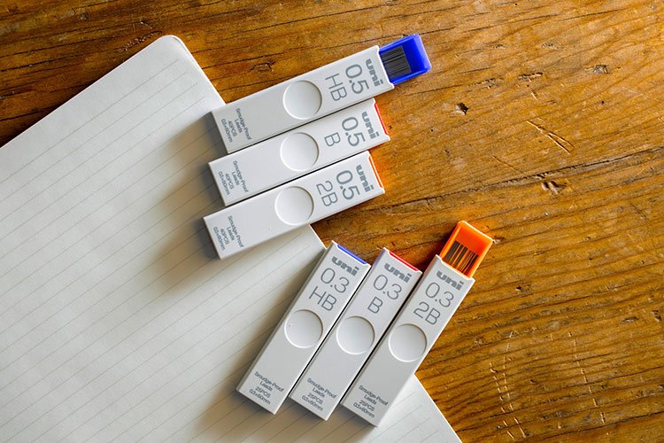 左から:芯径0.3㎜ HB、B、2B/芯径0.5㎜ HB、B、2B