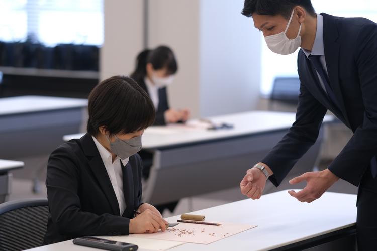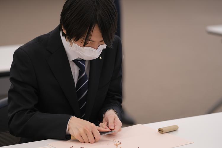 - 新入社員が、配布された鉛筆を小刀でけずります。