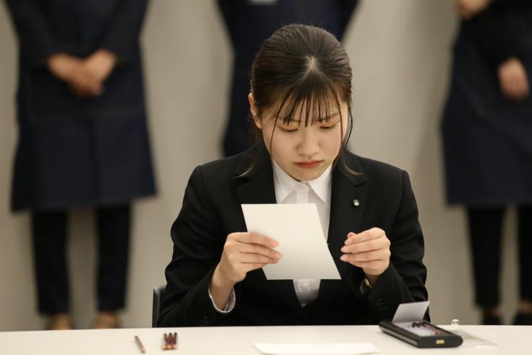 入社おめでとうございます。本日より、皆さんは三菱鉛筆の一員になります。この鉛筆けずり入社式のアイデアは当時の若手社員が「当社らしい入社式とは何か」を考えてカタチになったもので、人材も鉛筆も磨き続けて尖らせていくというコンセプトとなっています。今年の開催については、常に新しいことにチャレンジする社風にあわせてさらに進化させ、デッサンという表現体験を加えた一味違った鉛筆けずり入社式となっています。たくさんの見学者の中で緊張する面もありますが、ぜひそれを含めて入社式を楽しんでください。