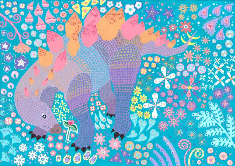 私は言葉のコミュニケーションが苦手です。だから絵を描いています。私の見る世界はあなたの世界とどのように違うのでしょうか?違うからこそ寄り添いあえるのかも知れません。華やかに咲く植物たちは愛すべき隣人です。 みんな、みんな、ありがとう。今回は大好きな恐竜に代弁して貰いました。画材はアクリル絵の具とポスカ(極細)を使用しています。