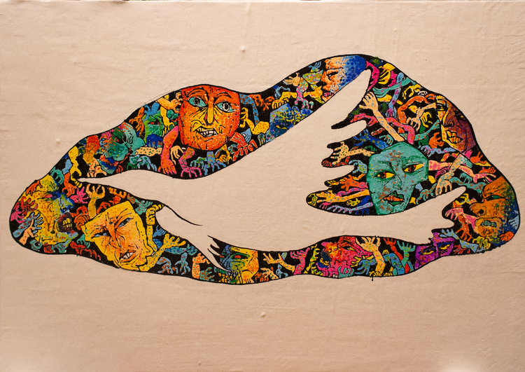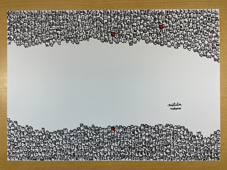 私の自分らしさは、「ユーモラスさ」、そして「ユニークさ」です。細い線で、動物の顔、街、建物などを表現し、それが集合していく中で作品全体のイメージが出来上がっていきます。完成すると、集合体が陸で、余白が海であるかのような「図と地」による形の面白さが感じられると思います。そして赤いリンゴは私のトレードマークでもあり、人を愉しませたいという「自分らしさ」の一つです。 -