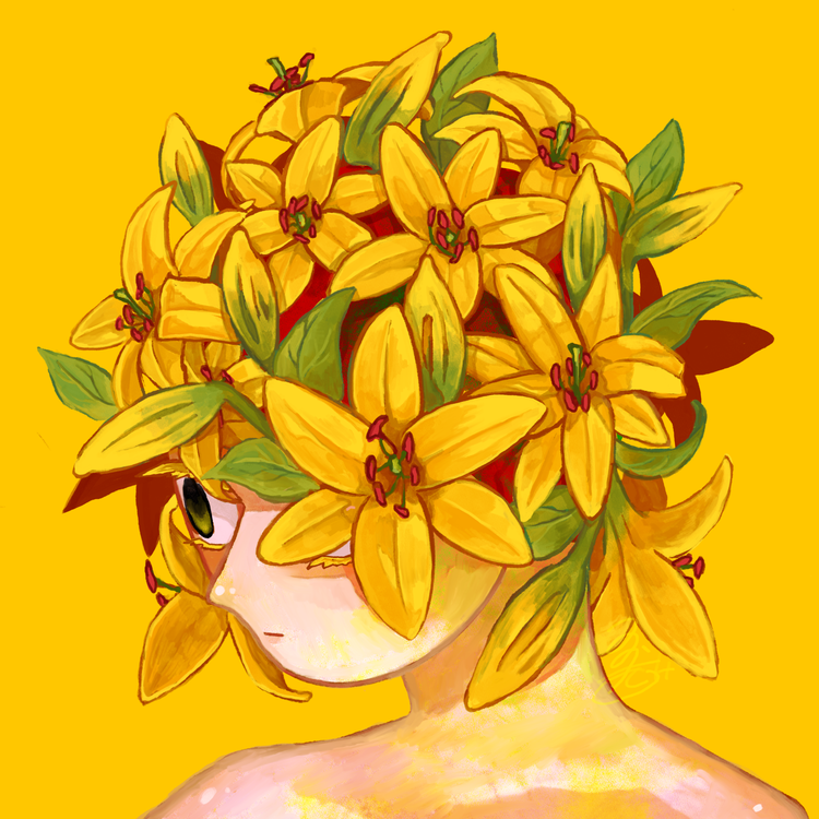 精神疾患による色々なことに対しての不安と日々戦っています。黄色い百合の花言葉にある「不安」を表現に取り入れ、頭が不安でいっぱいな感じを花で美しく表現しました。ネガティブに囚われがちなこの思考は誰かにとってこんな風に美しく映る日がくるかもしれない、という希望を込めて。 -