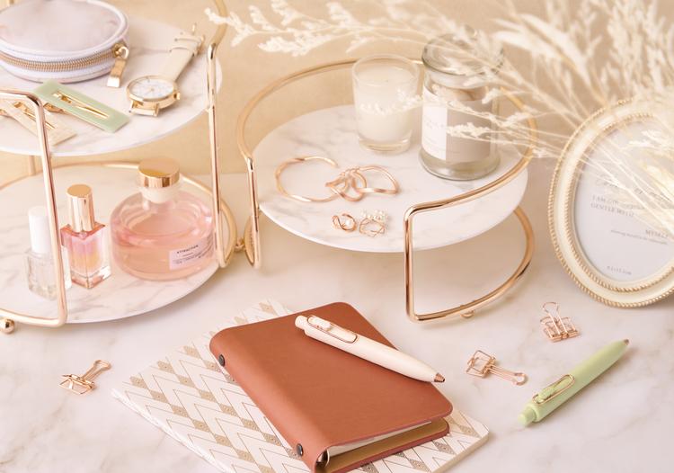 “ころんと、可愛い。”のキャッチコピーとイメージの重なる明るくかわいらしい色に仕上げました。琥珀糖をイメージしたふんわりと甘い色合いで『uni-ball one P』の癒やしの世界観をより色濃く演出しています。また、ローズゴールド仕様のクリップ、ペン先を採用したモデルもご用意しました。ローズゴールド系の手帳や小物とも親和性が高く、より一層上質な世界観を演出できます。