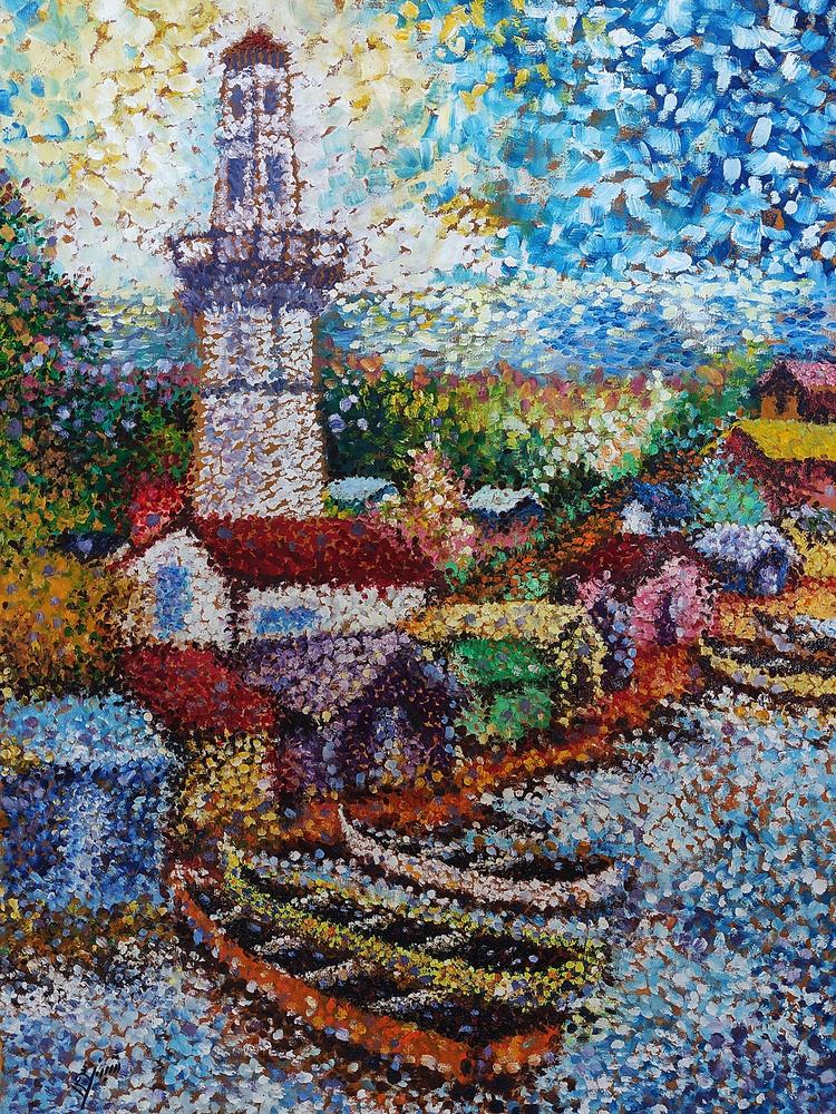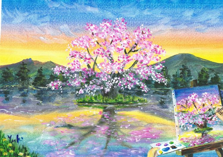 お花を見るのも、描くのも好きです。朝焼けの空は過ぎ行く日々の中にある希望を込めました。光を受け、咲き誇る桜は、湖面の、そして心のゆらぎに負けずに意志を持って、しっかりと立つ自らへの勇気や、生きていく為の力強さ。そしてそれらを描く事で、時に不安定になる自分自身の心を保ち、生き続ける意志や意味となる。それらを表現しました。 -