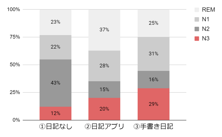 上記2.における三つの条件(①何もしない、②アプリで日記を書く、③手書きで日記を書く)で睡眠の質を比較したところ、疲労回復や認知機能に関連するN3(深睡眠)の割合が最も高かったのが、③手書きで日記を書く(29%)、次いで②アプリで日記を書く(20%)、①何もしない(12%)でした。