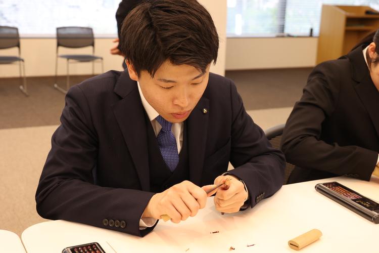 • ✏ 先輩社員が手本を披露した後、新入社員が再び鉛筆を小刀でけずります。