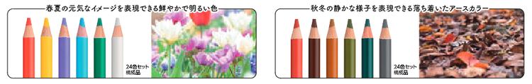 12色セットには特によく使われる色を厳選してそろえております。24色セットは、自然の中に存在する色みをイメージし、明るく鮮やかなトーンから暗めの落ち着いたトーンまでを組み合わせ、身近に感じられる色彩を楽しんでいただけるようにしました。