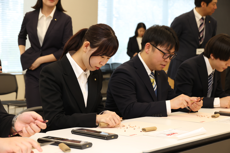 新入社員が、配布された鉛筆を小刀でけずりました。 - ✏ 先輩社員が手本を披露した後、新入社員が再び鉛筆を小刀でけずりました。