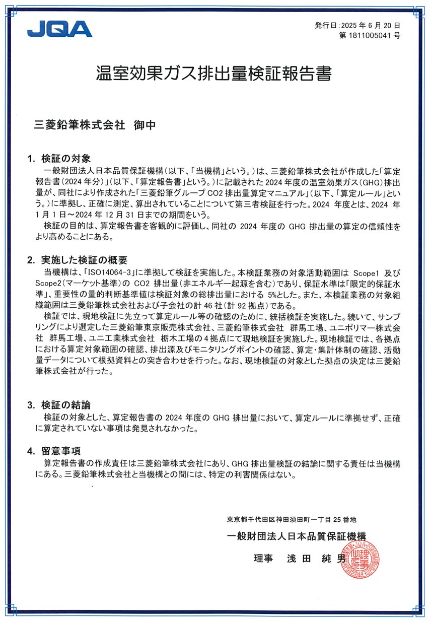 2024年のCO2排出量データ(Scope1,2)に不備が無いことが認められ、温室効果ガス排出量検証報告書を取得しました。