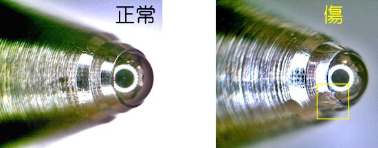 - ペンの先端(ペン先)は、金属を薄いパイプ状に加工した後、微細なボールを組みつけられた繊細な構造をしています。そのため、ペン先で物を突いたり、金属製の定規で線を引いたり、また、ペン先から床に落すだけでもペン先は簡単に傷つきます。