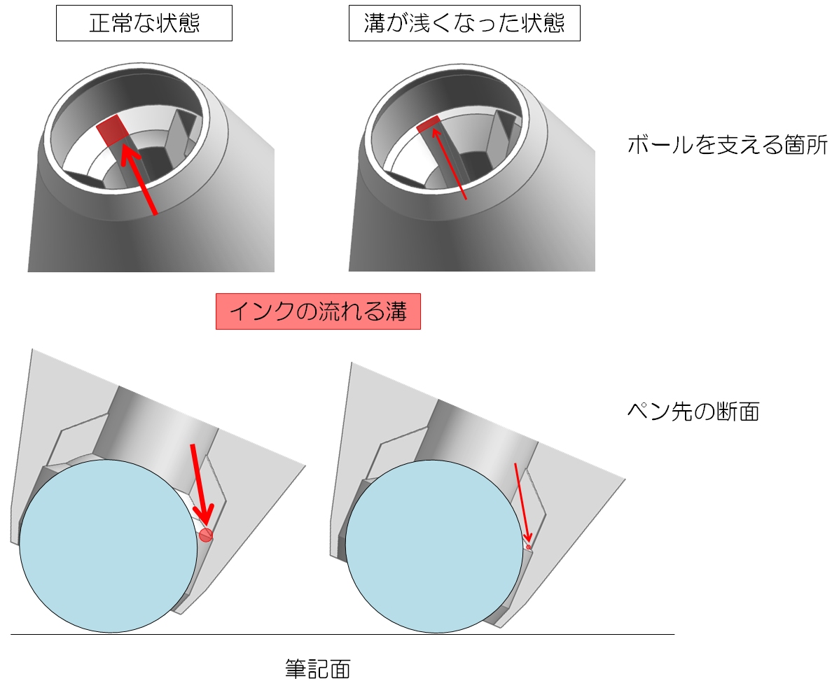 - ボールペンのペン先は、インクの流れる溝が付いた金属(主にステンレス)の「パイプ」が、超硬合金の「ボール」を支える構造をしています。そのため、繰返し強い筆圧で筆記したり、強い衝撃がペン先に加わったりすると、ボールが「ボールを支える箇所」を削ったり変形させたりします。その結果、上図のように「インクの流れる溝」が浅くなり、インクが流れにくく、場合によっては、書けなくなります。