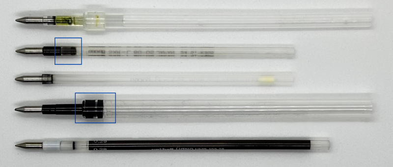 青枠で囲んだ箇所は残ったインクのように見えますが、これは、インクが入っていた「チューブ」と、替芯の先端の金属「チップ」をつなげる部品です。
