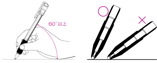 - また、あまり寝かせて書くとボールを保持する部品が紙面で摩耗し、ペン先が傷ついた時と同様に、描線が太くなったり、インクが漏れ出す場合があります。ボールペンは紙の上でボールが回転することで、ペンのインクが紙へ転写します。そのため、ボールが回転する60°以上の角度で筆記するのが理想的です。