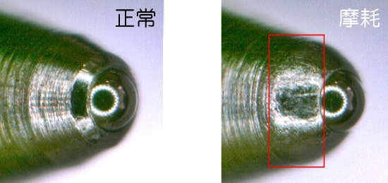 ペンの先端(ペン先)は、金属を薄いパイプ状に加工した後、微細なボールを組みつけられた繊細な構造をしています。そのため、ペン先で物を突いたり、ペン先から床に落とすだけでもペン先は傷つき、場合によってはペン先が変形して、描線が太くなったり、インクが漏れ出すことがあります。