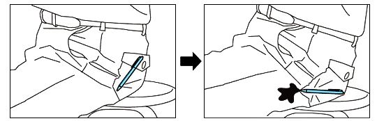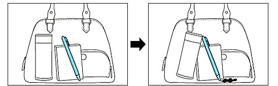 - ノック式の場合は、上のイラストのように「気付かぬうちにノックボタンが押され」ペン先がカバンの中のものや衣類などに触れることで、インクが漏れる場合があります。