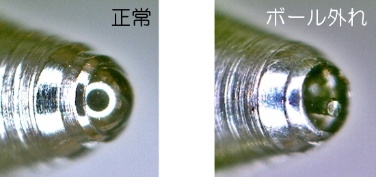 - ボールペンの先端は、薄い金属のパイプに微細なボールを組みつけた非常にデリケートな構造をしています。そのため、床に落とすような強い衝撃が加わると写真のようにボールが外れ、ペンの先からインクが漏れる場合があります。