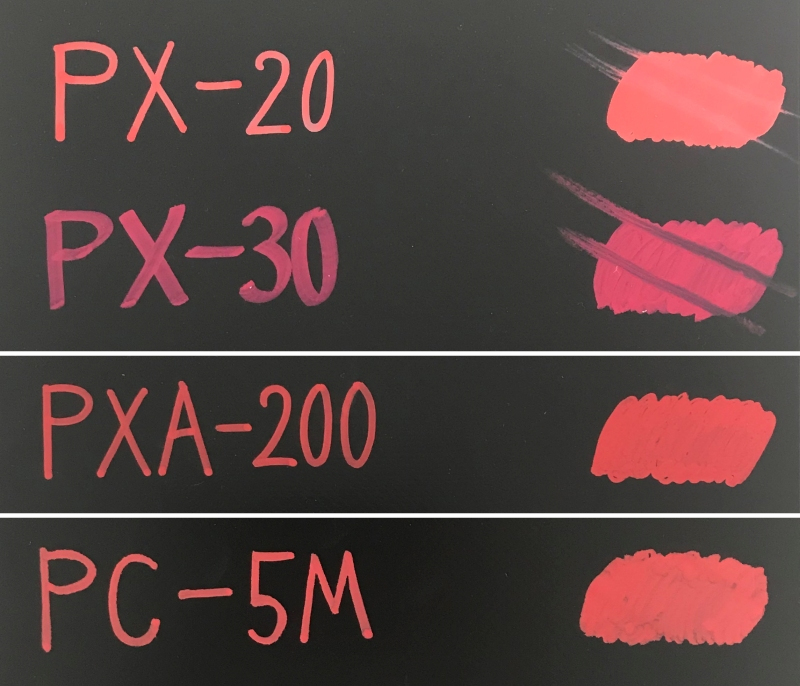 ・ペイントマーカー PX-20 油性(白:顔料、赤:染料)インク。主溶剤はキシレン。