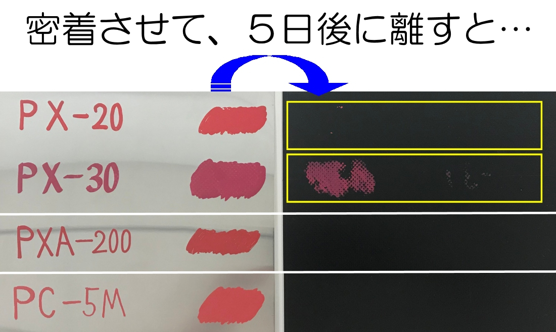 着色剤は、染料よりも溶け出しにくい顔料インクが、また、水性の接着剤ならば油性のペンのように、接着剤や粘着剤と異なる溶剤のインクが適していると考えます。しかし、溶解力の強い接着剤や粘着剤に触れれば、顔料インクでも溶け出す場合が考えられますので、インクとの相性をあらかじめ確認してからご利用ください。