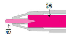 インクを含んだ綿から、芯へインクが伝わります。 |