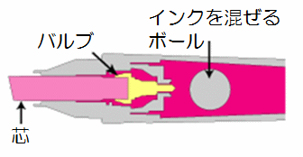 インクタンクと芯の間にあるバルブの開閉で、少しずつインクが出てきます。バルブを開く時は、芯をペン側に押し込みます。 |