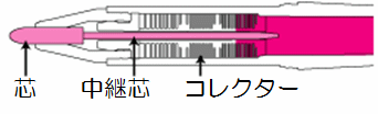 インクタンクと芯が中継芯で繋がっています。インクタンク内の空気圧が変化するなどで、漏れ出したインクを一時的に溜める機能が、コレクターです。 |