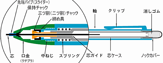 なお、芯ホルダーは、上の「ノックで一定量が繰り出される」シャープとは異なり、収納された芯が「自重で落下する」機構をしています。