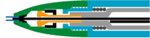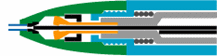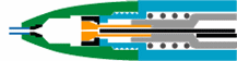 ④再びノックをすると三ツ割チャックが、芯を押し出し、保持チャックに芯が入り押さえます。ノックを押し切ると三ツ割チャックが開きます。 |
