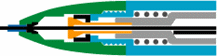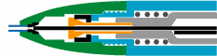 ⑤ノックを離すと、保持チャックが芯を押さえたまま、三ツ割チャックは戻って閉じ、芯を押さえます。 |