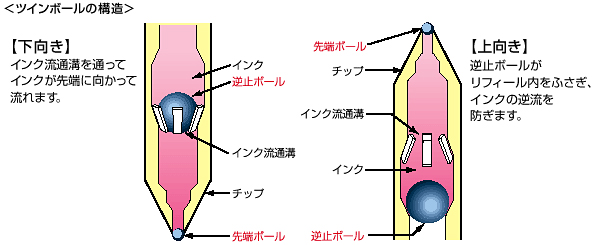 - 筆記する「先端ボール」の他に、ペンの中へ二つ目のボールである「逆止ボール」を設けた機構が「ツインボール機構」です。