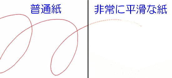 鉛筆やシャープで下書きした紙面は筆圧がかかり、上の写真の「非常に平滑な紙(ツルツルした紙面)」のように、ボールが紙の上で回転せずスリップしてしまい、インクが紙面へ乗りにくくなる場合があります。