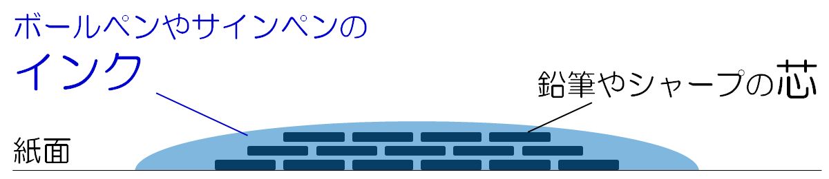 上のイラストは、下書きの上にペンで書いた紙を横から見たイメージです。ボールペンやサインペンのインクは、下書きの鉛筆やシャープの芯(描線)に重なって紙面に乗ります。そのため、下書きを消しゴムで消そうとしてもインクがあるため消えにくく、消える時はボールペンやサインペンのインクも一緒に紙面から離れるため、インクの色が薄くなります。