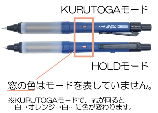 KURUTOGAモードで筆記し、芯が回ると窓の色も変わります。窓の色はモードの違いを表したものではありません。