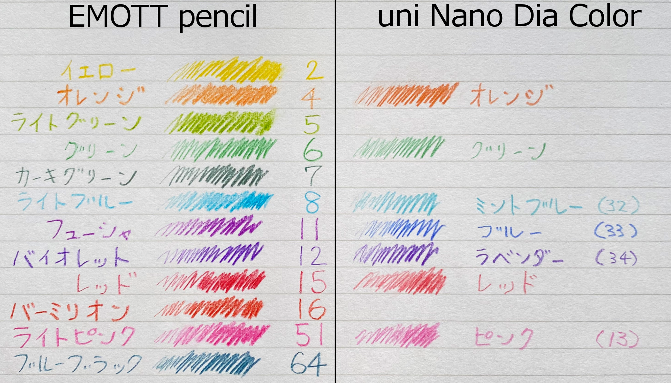 EMOTT pencil と uni Nano Dia Color の色の違い