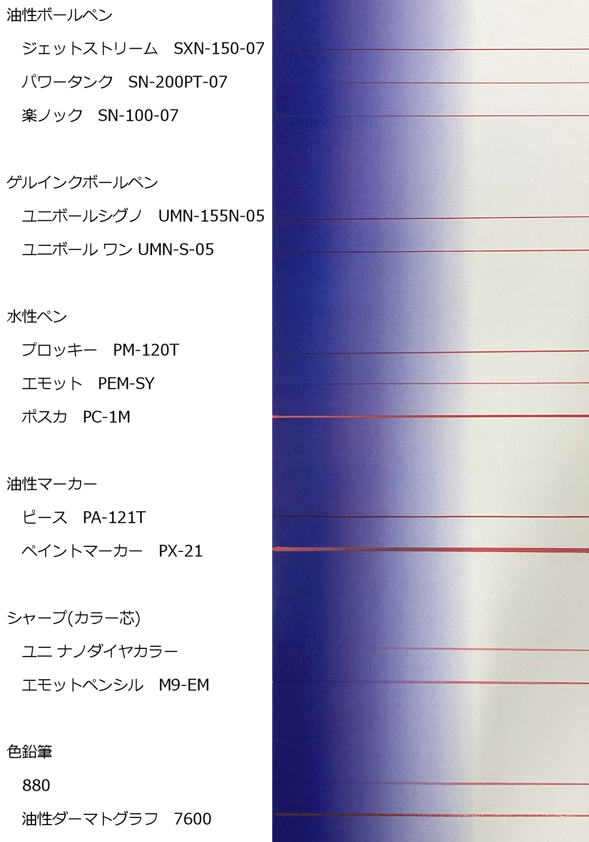 写真はトナーで印刷をする一般的なカラープリンター(カラーコピー機)から出力したPPC用紙(コピー用紙)へ、様々な赤インクで筆記した例です。 一般的なトナーは、発色剤やワックスなどを含んだ微細な合成樹脂(プラスチック)で印刷をします。そのため、トナーがインクを弾いたり、ボールペンではボールがスリップして回りにくくなったりすることで、インクの載りは悪くなります。