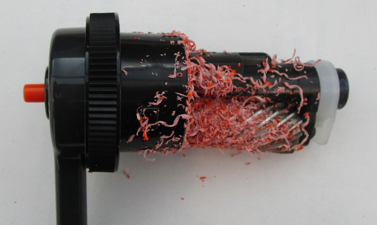 このような鉛筆を当社の手動シャープナー(ハンドルを回して削るタイプ)で削ると、カッターへ削りカスや芯が付着し、削れなくなる場合があります。※生産を終了した電動シャープナーも同様です。