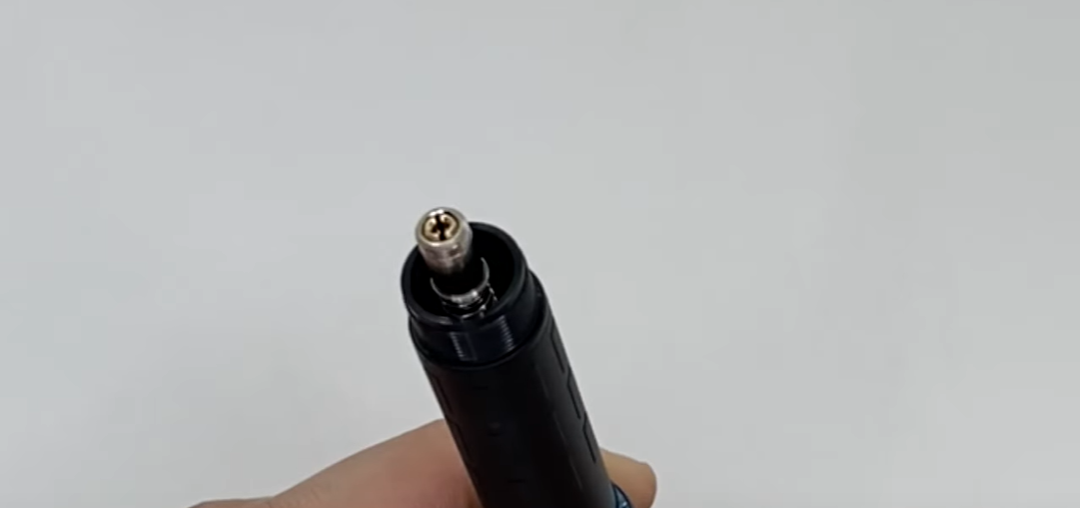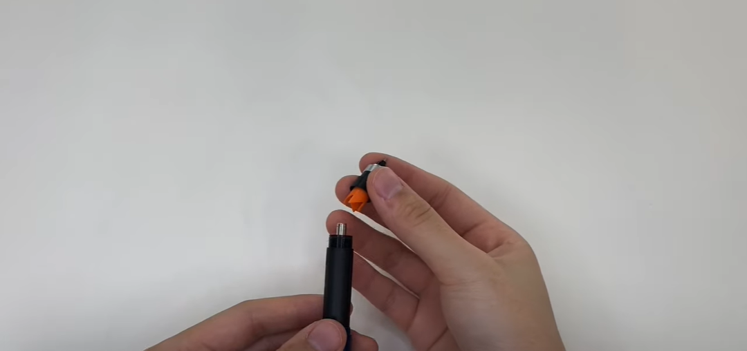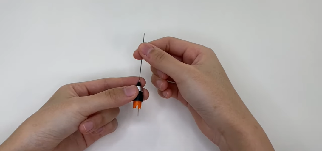 先端の部品は、ペン先を上にし、オレンジの部品を傷つけないよう慎重に差し込み、ダイヤルの下を回して締め付けます。