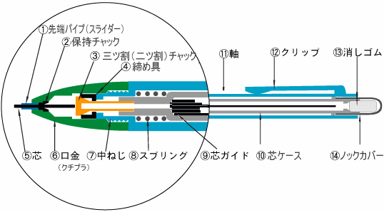 上図の「⓵先端パイプ」から芯を補充すると短くなった芯が「⑩芯ケース」に押し戻されて溜まり「芯を入れすぎた場合」と同様に芯詰まりを起こす場合があります。芯の補充は必ずノックカバー側(後端側)から行ってください。