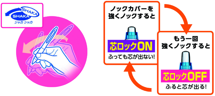 振ると芯が出てくる「シャカシャカ機構」が搭載されたシャープには、使わない時に芯が出てこない「芯ロック機構」を搭載しています。